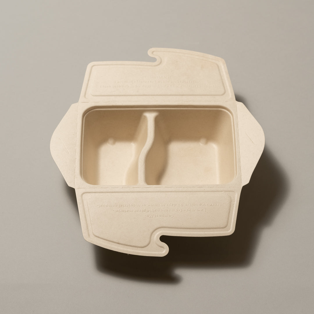 古古紙等の木材パルプが原料で、サステナブルなテイクアウト容器です。ラミネート加工によって、耐水性・耐油性を向上させています。テイクアウトやデリバリー向けの使用となっています。パルプモールド容器は、弁当容器以外にも丼容器などのラインアップが豊富です。SDGsに配慮した、脱プラなテイクアウト容器です。
