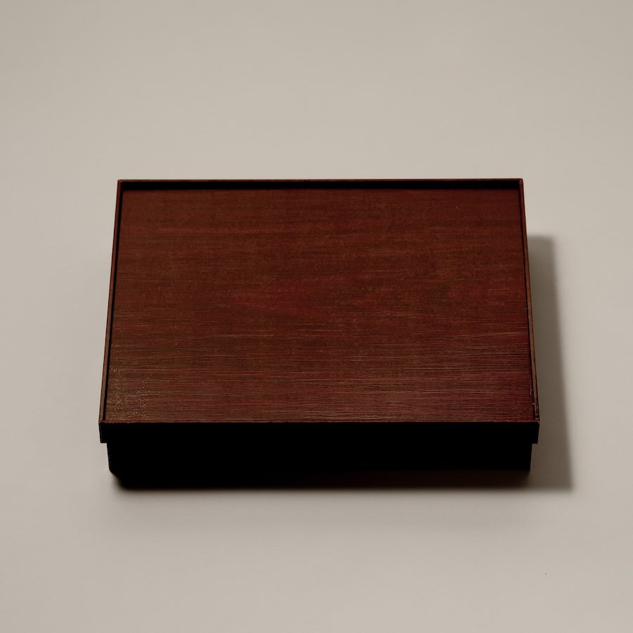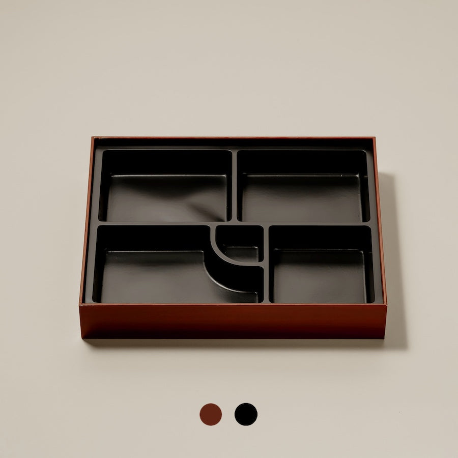 漆柄の上質な質感のある紙製容器に、耐水・耐油性のあるトレーをセットにしたかぶせ蓋タイプの高級弁当箱。