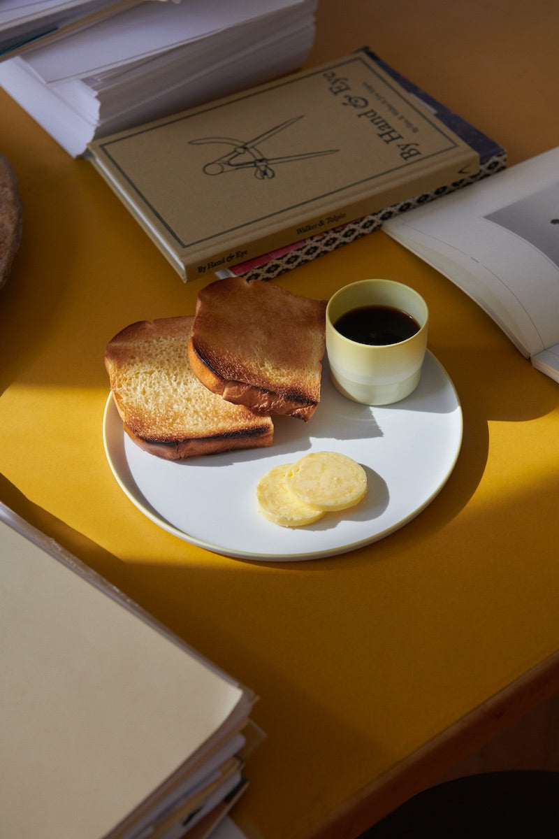 日本の伝統色である、淡く、果敢ない色の層を重ねながら、陶磁器という文脈の中で再解釈したテーブルウェアのシリーズは、現代的で非常に機能性の高い形の中に、有田の特有の色遣いが反映されています。