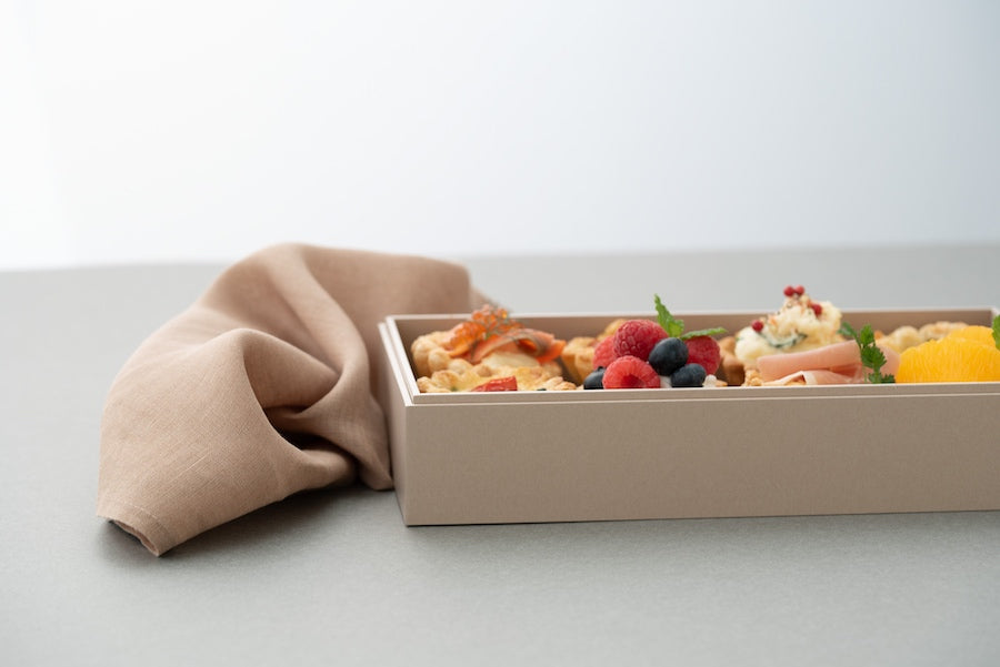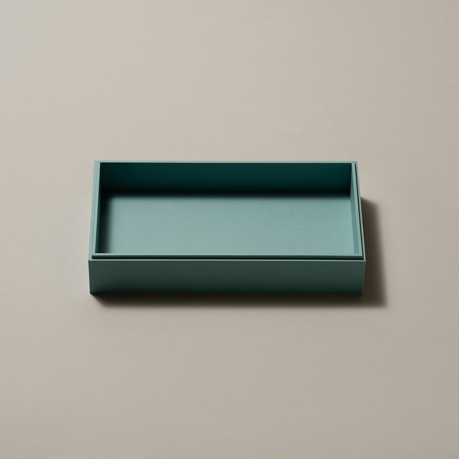 100%再生紙を使った板紙に、漆風・木目柄・マッド調などの紙を張り合わせることで、サステナブルかつ高級感があります。